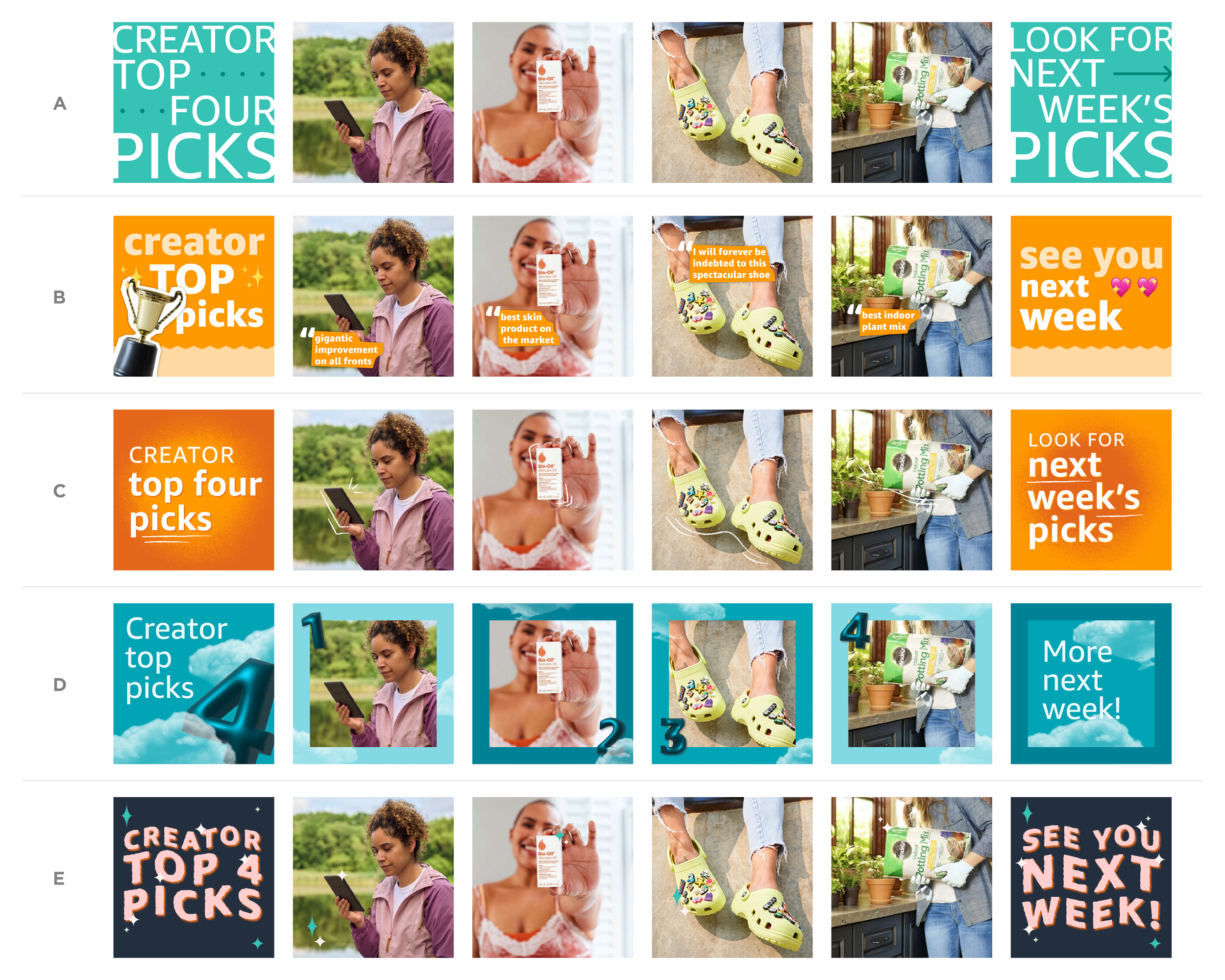 The Amazon Associates Program social team wanted to refresh their Instagram social style in order to be more relevant to current TikTok and Instagram video trends. I was tasked with researching social trends and storyboarding visual options, while still sticking closely to the current Associates Program style guide.